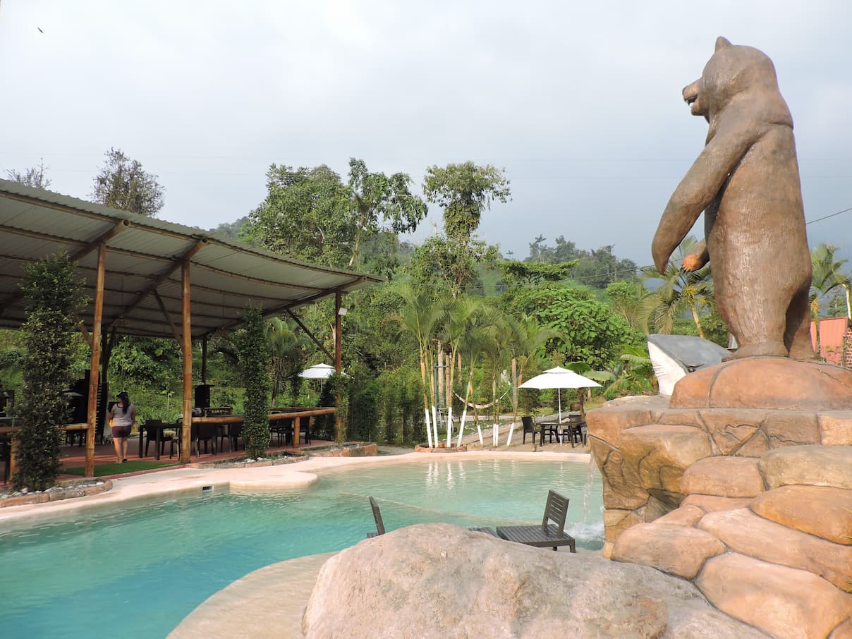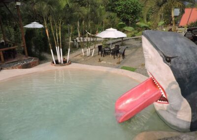 Uno de los mayores atractivos es el área de piscinas, ubicada frente al comedor y espacio social y la cabaña principal. Tiene una para adultos, otra para niños y la de hidromasaje. A los costados cuenta con mesas, parasoles y sillas, como complemento.